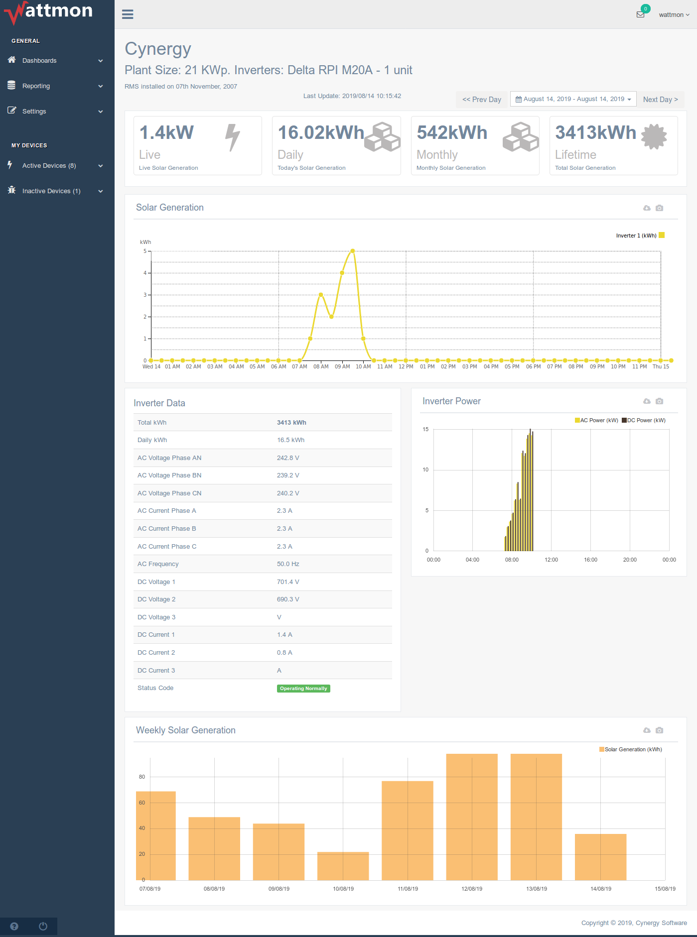 Represented below is a sample Dashboard for a single inverter, which features several elements - the top-bar buttons that display the live, daily, monthly and total generation for the site; a line graph for solar generation in kWh; select live inverter parameters; a bar graph plotting the AC Power against the DC Power; and a bar graph displaying the generation for each day in the last week.
