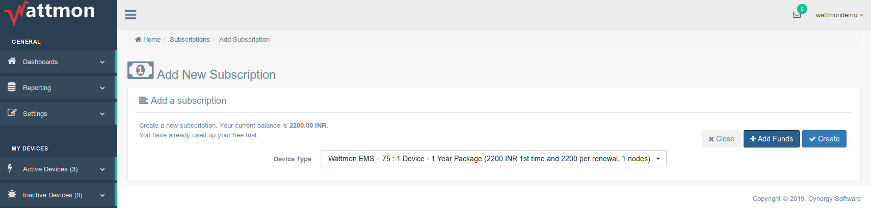 In order to add a subscription for a new device, first check if your account has sufficient balance. If you do, proceed to click on the +Add New button to open the Add New Subscription page, as shown below.