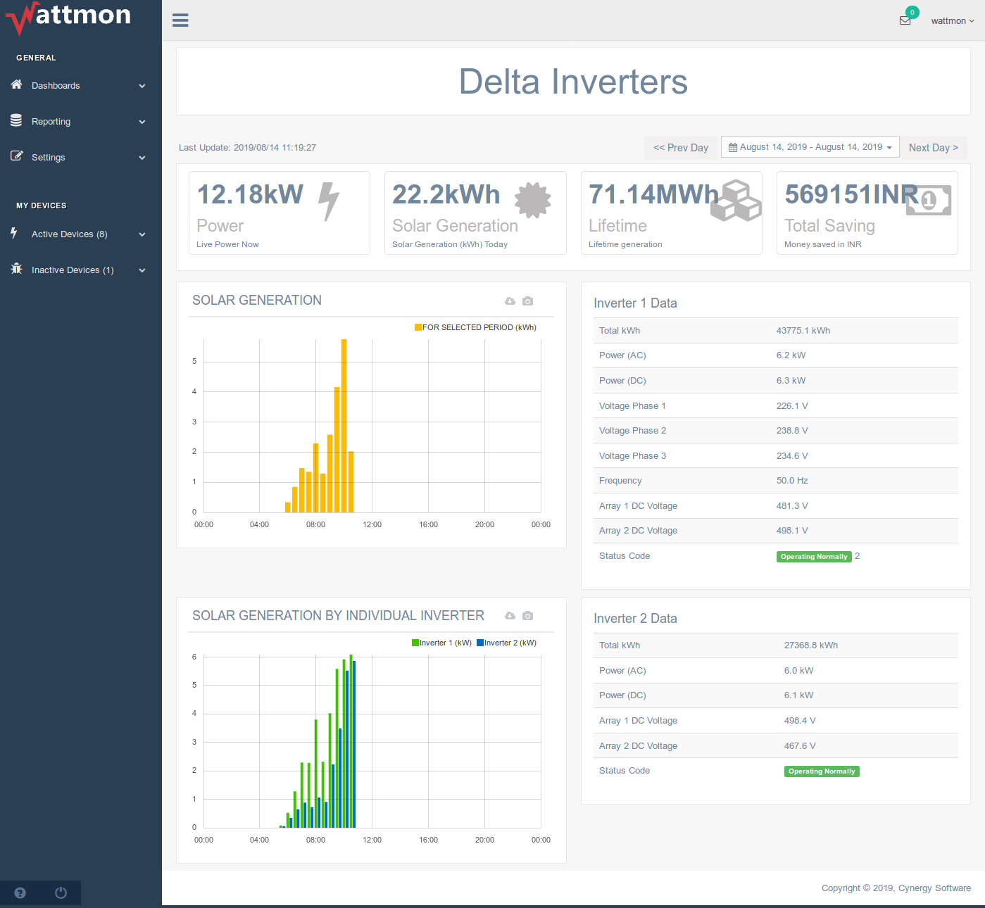 Represented below is a sample Dashboard for multiple inverters, not necessarily of the same make, which features several elements - the top-bar buttons that display the live, daily and total generation for the site along with the financial savings; a bar graph for solar generation in kWh; select live inverter parameters for both inverters; a bar graph plotting the AC Power production from each inverter.